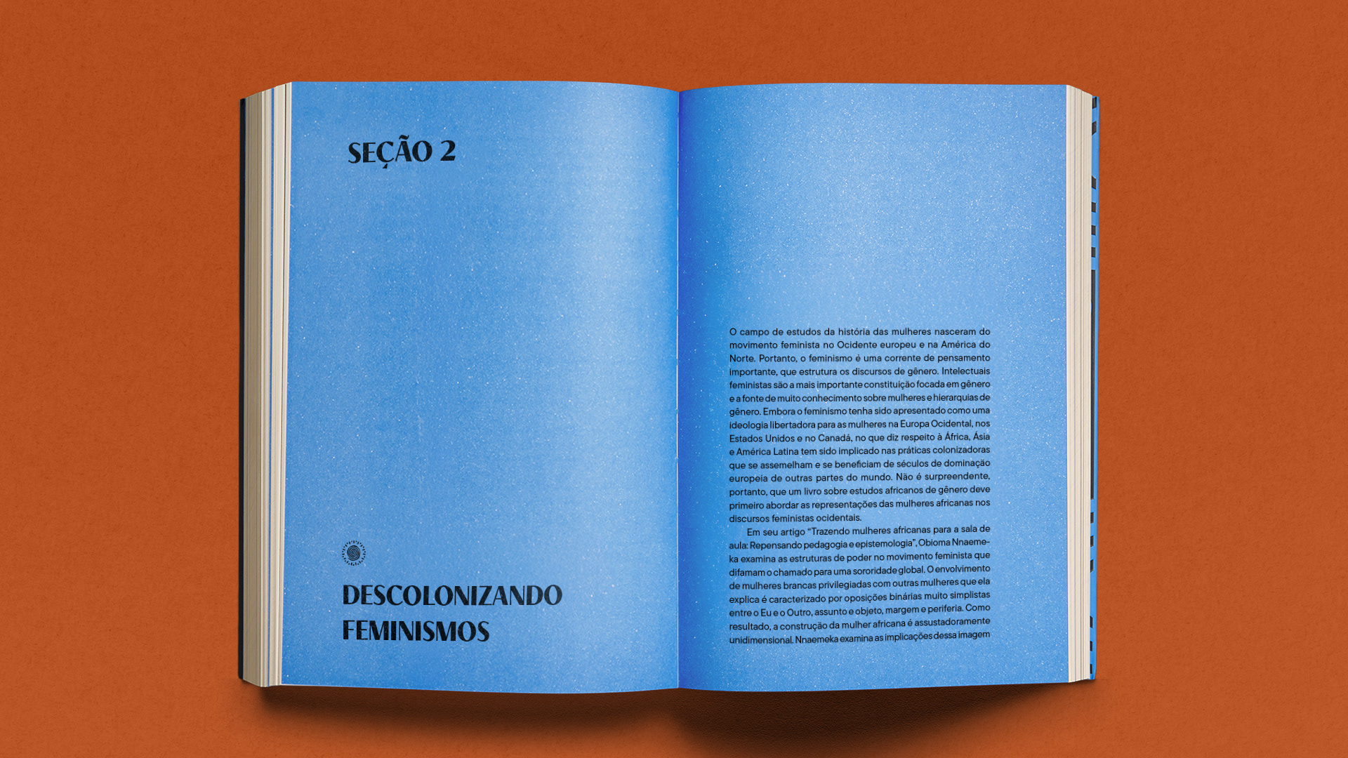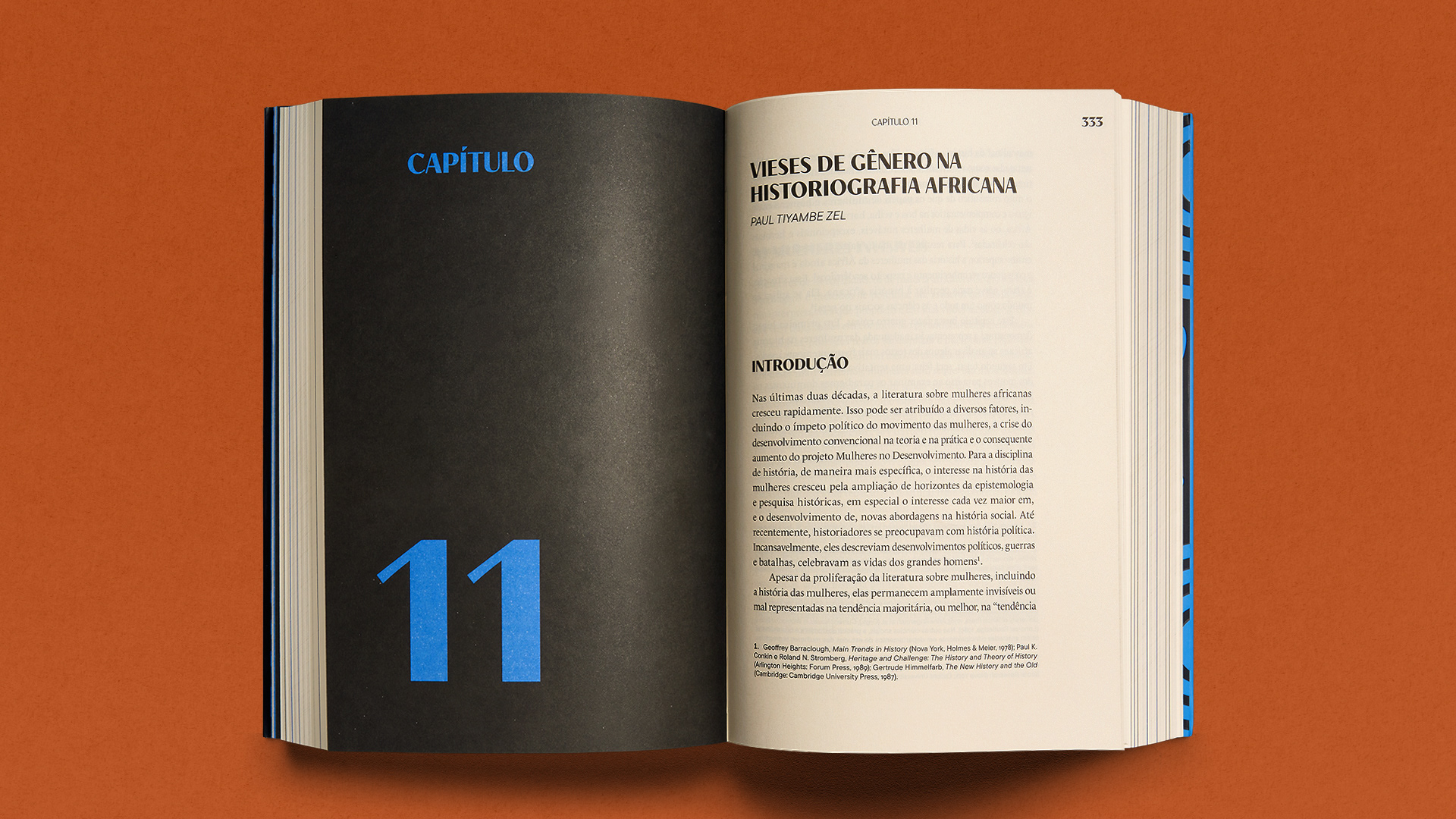 Azul: Aplicado nas aberturas de seções para sinalizar grandes transições temáticas e proporcionar o respiro visual necessário em uma obra teórica densa. Preto: Utilizado nas aberturas de capítulos para gerar contraste, autoridade e foco imediato no início de cada nova discussão.